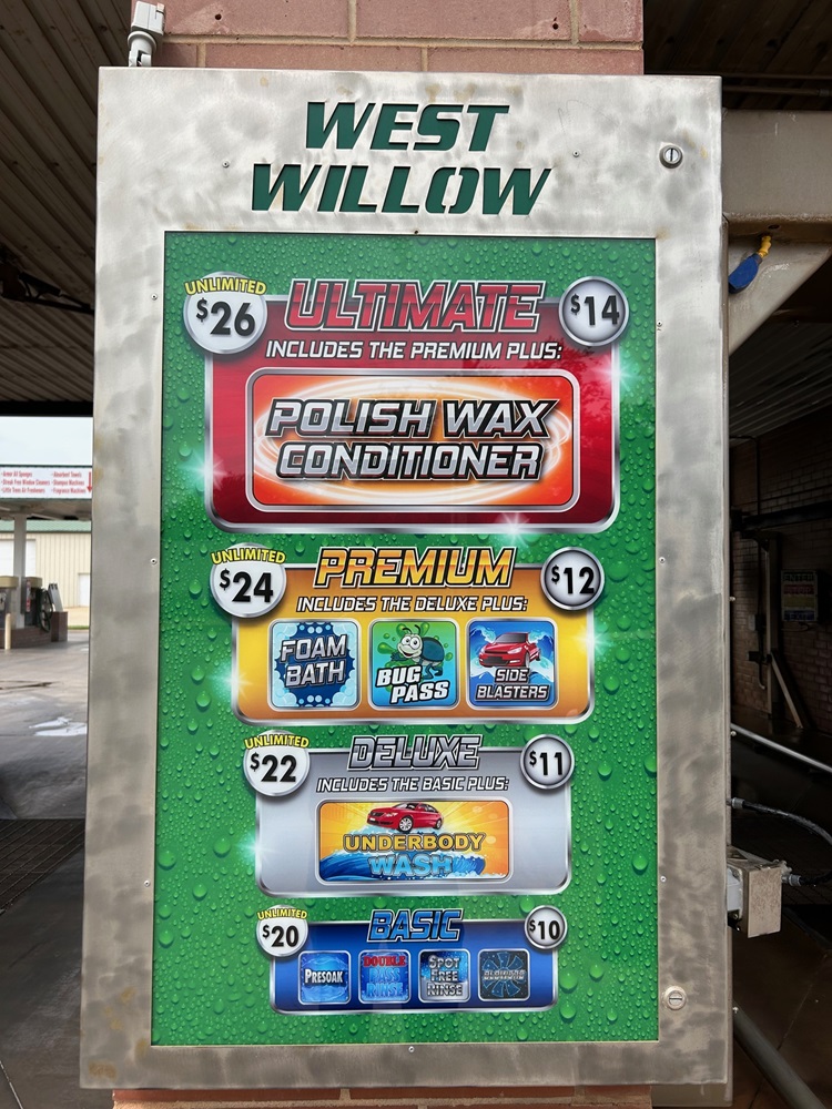 | PREMIUM | Undercarriage Wash, Presoak, Soap Bug Pass, Color Foam Bath, 2 Side Blasters, 2 Rinses with Bug Pass, Spot Free Rinse, Blowers | $12 | $24 |
